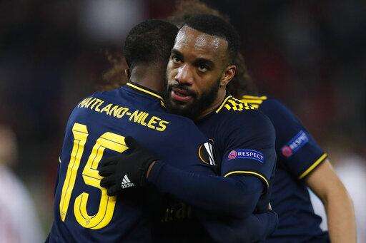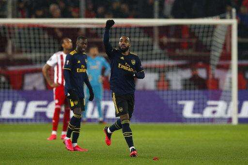 Arsenal's Alexandre Lacazette celebrates after scoring the opening goal of his team against Olympiakos during the Europa League round of 32, first leg, soccer match between Olympiakos and Arsenal at the Georgios Karaiskakis stadium in Piraeus port, near Athens, Thursday, Feb. 20, 2020. (AP Photo/Thanassis Stavrakis)