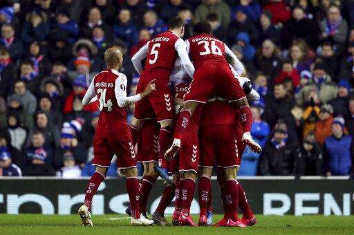Sporting Braga's players celebrate their first goal of the game during the Europa League round of 32 first leg soccer match between Rangers and Sporting Braga at Ibrox Stadium, Glasgow, Scotland, Thursday, Feb. 20, 2020. (Andrew Milligan/PA via AP)