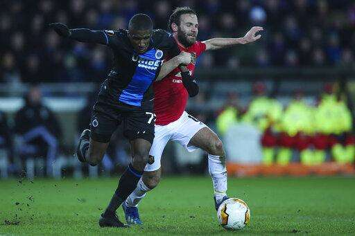 Manchester United's Juan Mata, right, vies for the ball with Brugge's Clinton Mata during Europa League round of 32 first leg soccer match between Brugge and Manchester United at the Jan Breydel stadium in Bruges, Belgium, Thursday, Feb. 20, 2020. The match ended in a 1-1 draw. (AP Photo/Francisco Seco)