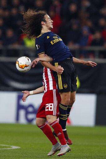 Arsenal's Matteo Guendouzi, right, challenges for the ball with Olympiakos' Mathieu Valbuena during the Europa League round of 32, first leg, soccer match between Olympiakos and Arsenal at the Georgios Karaiskakis stadium in Piraeus port, near Athens, Thursday, Feb. 20, 2020. Arsenal won 1-0. (AP Photo/Thanassis Stavrakis)