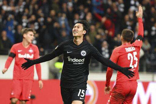 Frankfurt's Daichi Kamada celebrates scoring his side's second goal during the Europa League round of 32 first leg soccer match between Eintracht Frankfurt and FC Red Bull Salzburg at the Commerzbank-Arena in Frankfurt, Germany, Thursday, Feb. 20, 2020. (Arne Dedert/dpa via AP)