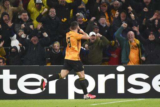 Wolverhampton Wanderers' Ruben Neves celebrates after scoring his side's second goal during the Europa League round of 32 match between Wolverhampton Wanderers and Espanyol at the Molineux Stadium, in Wolverhampton, England, Thursday Feb. 20, 2020. (AP Photo/ Rui Vieira)