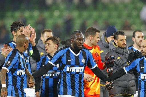 Inter Milan's Romelu Lukaku, center, salutes fans at the end of the Europa League, round of 32, first leg, soccer match between PFC Ludogorets Razgrad and Inter Milan at Huvepharma Arena in Razgrad, Bulgaria, Thursday, Feb. 20, 2020. (AP Photo/Vadim Ghirda)