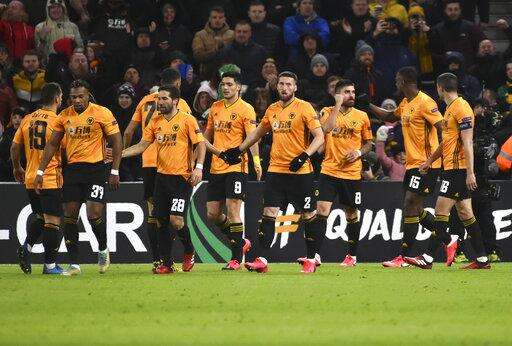 Wolverhampton Wanderers' Ruben Neves, third right, celebrates after scoring his side's second goal during the Europa League round of 32 match between Wolverhampton Wanderers and Espanyol at the Molineux Stadium, in Wolverhampton, England, Thursday, Feb. 20, 2020. (AP Photo/ Rui Vieira)