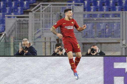 Roma's Carles Perez celebrates after scoring during the Europa League round of 32 first leg soccer match between Roma and Gent at Rome's Olympic stadium, Thursday, Feb. 20, 2020. (AP Photo/Gregorio Borgia)