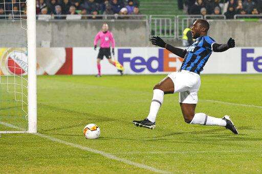 Inter Milan's Romelu Lukaku fails to score during an Europa League, round of 32, first leg, soccer match between PFC Ludogorets Razgrad and Inter Milan at Huvepharma Arena in Razgrad, Bulgaria, Thursday, Feb. 20, 2020. (AP Photo/Vadim Ghirda)
