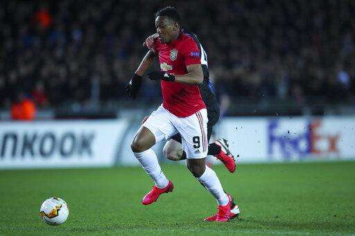 Manchester United's Anthony Martial, left, celebrates with teammates after scoring his side's first goal during an Europa League round of 32 first leg soccer match between Brugge and Manchester United at the Jan Breydel stadium in Bruges, Belgium, Thursday, Feb. 20, 2020. Martial scored once and the match ended in a 1-1 draw. (AP Photo/Francisco Seco)