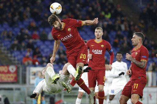 Roma's Federico Fazio, center, and Gent's Roman Bezus, left, vie for the ball during their Europa League round of 32 first leg soccer match between Roma and Gent at Rome's Olympic stadium, Thursday, Feb. 20, 2020. (AP Photo/Gregorio Borgia)