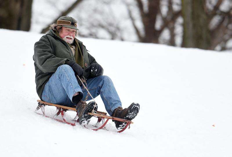 Bud School, 72, of Elgin, rides a sled older than he is down a hill at Wing Park in Elgin Monday. He was there with is daughter and grandkids. He said the sleds they used today are probably between 75-80 years old and "were around when I was a kid, and I know my dad used one of them," he said.