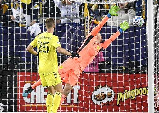 Nashville SC goalkeeper Joe Willis, right, cannot reach a goal by Atlanta United midfielder Emerson Hyndman (not shown) during the first half of an MLS soccer game in Nashville, Tenn., Saturday, Feb. 29, 2020. Nashville defender Walker Zimmerman (25) looks on. (Andrew Nelles/The Tennessean via AP) The Associated Press