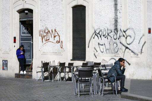 A man sits at a table as others are empty at a cafe in Largo Argentina square amid growing concern about the spread of a new coronavirus in Rome Saturday, March 7, 2020. Italy is taking an almighty hit to its already weak economy from being the focal point of the coronavirus emergency in Europe. (Cecilia Fabiano/LaPresse via AP) The Associated Press