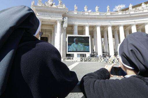Nuns watch Pope Francis on a giant screen as he delivers the Angelus, in St. Peter's Square, at the Vatican, Sunday, March 8, 2020. Italy's Prime Minister Giuseppe Conte announced a sweeping coronavirus quarantine early Sunday, restricting the movements of about a quarter of the country's population in a bid to limit contagions at the epicenter of Europe's outbreak. (AP Photo/Andrew Medichini) The Associated Press