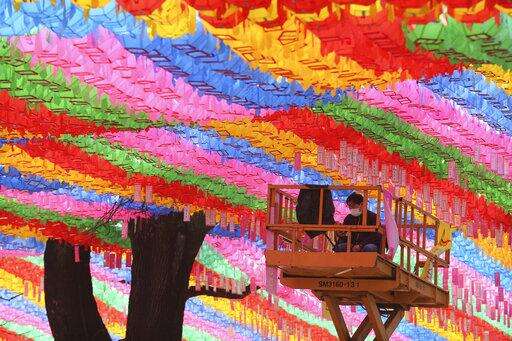 A worker wearing a face mask watches his smart phone under lanterns in preparation for the upcoming birthday of Buddha on April 30 at the Chogyesa temple in Seoul, South Korea, Sunday, March 8, 2020. The number of infections of the COVID-19 disease continues to spread around the globe. (AP Photo/Ahn Young-joon) The Associated Press