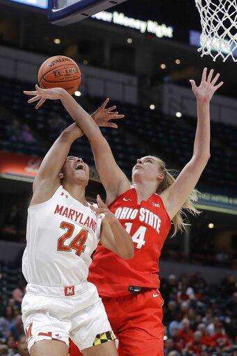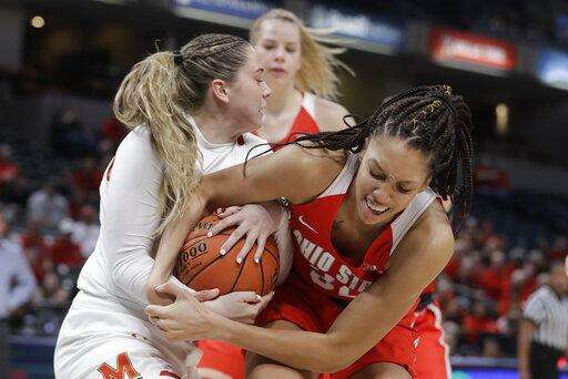 Maryland's Faith Masonius, left, and Ohio State's Aaliyah Patty battle for a rebound during the first half of an NCAA college basketball championship game at the Big Ten Conference tournament, Sunday, March 8, 2020, in Indianapolis. (AP Photo/Darron Cummings) The Associated Press