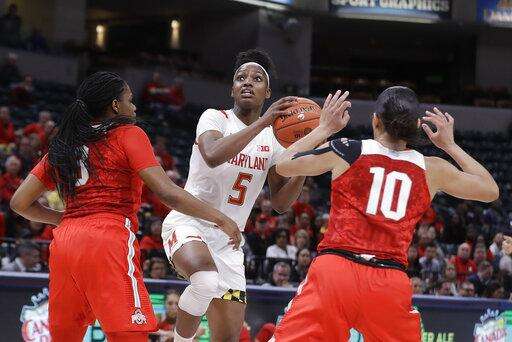 Maryland's Kaila Charles (5) puts up a shot against Ohio State's Janai Crooms (3) and Braxtin Miller (10) during the first half of an NCAA college basketball championship game at the Big Ten Conference tournament, Sunday, March 8, 2020, in Indianapolis. (AP Photo/Darron Cummings) The Associated Press
