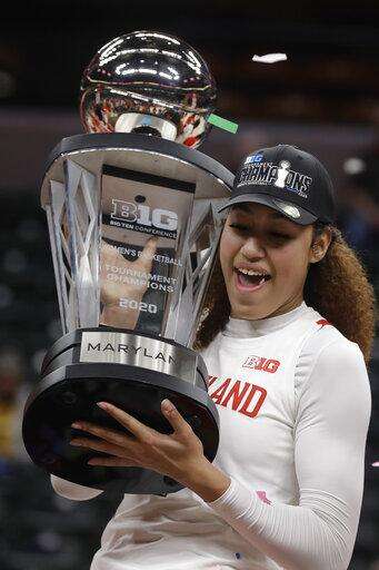 Maryland's Shakira Austin holds the trophy after her team defeated Ohio State to win the NCAA college basketball championship game at the Big Ten Conference tournament, Sunday, March 8, 2020, in Indianapolis. (AP Photo/Darron Cummings) The Associated Press