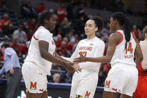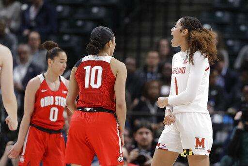 Maryland's Ashley Owusu (15) reacts to Blair Watson (22) and Diamond Miller (14) after Owusu hit a shot and was fouled during the first half of an NCAA college basketball championship game against Ohio State at the Big Ten Conference tournament, Sunday, March 8, 2020, in Indianapolis. (AP Photo/Darron Cummings) The Associated Press