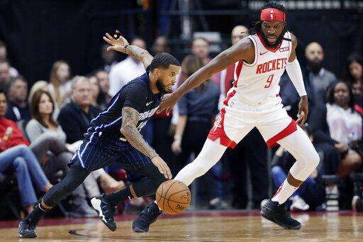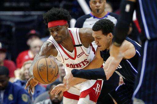 Houston Rockets forward Danuel House Jr., left, knocks the ball away from Orlando Magic forward Aaron Gordon (00) during the first half of an NBA basketball game Sunday, March 8, 2020, in Houston. (AP Photo/Michael Wyke) The Associated Press