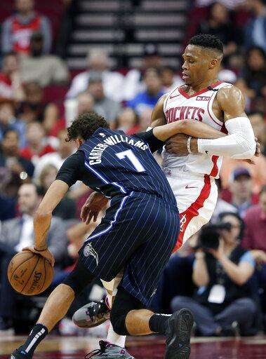 Houston Rockets guard Russell Westbrook, left, drives around Orlando Magic guard Michael Carter-Williams, right, during the first half of an NBA basketball game Sunday, March 8, 2020, in Houston. (AP Photo/Michael Wyke) The Associated Press