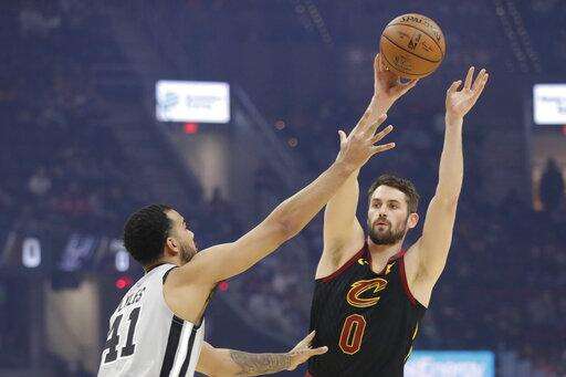Cleveland Cavaliers' Kevin Love (0) passes over San Antonio Spurs' Trey Lyles (41) in the first half of an NBA basketball game, Sunday, March 8, 2020, in Cleveland. (AP Photo/Tony Dejak) The Associated Press