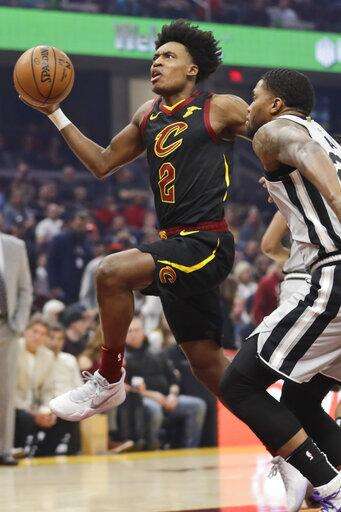 Cleveland Cavaliers' Collin Sexton, left, drives against San Antonio Spurs' Rudy Gay in the first half of an NBA basketball game, Sunday, March 8, 2020, in Cleveland. (AP Photo/Tony Dejak) The Associated Press