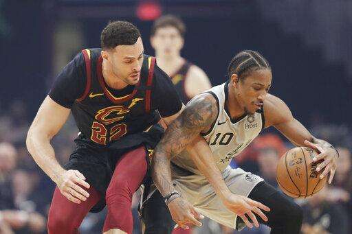 San Antonio Spurs' DeMar DeRozan (10) drives against Cleveland Cavaliers' Larry Nance Jr. (22) in the first half of an NBA basketball game, Sunday, March 8, 2020, in Cleveland. (AP Photo/Tony Dejak) The Associated Press
