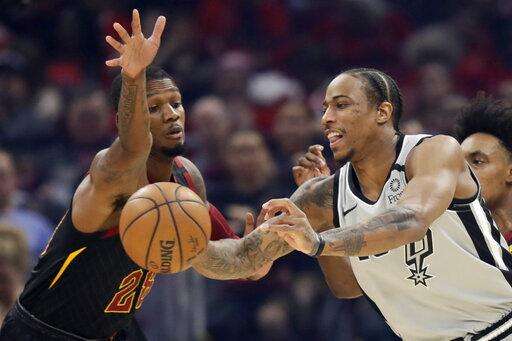 San Antonio Spurs' DeMar DeRozan, right, passes against Cleveland Cavaliers' Alfonzo McKinnie in the first half of an NBA basketball game, Sunday, March 8, 2020, in Cleveland. (AP Photo/Tony Dejak) The Associated Press