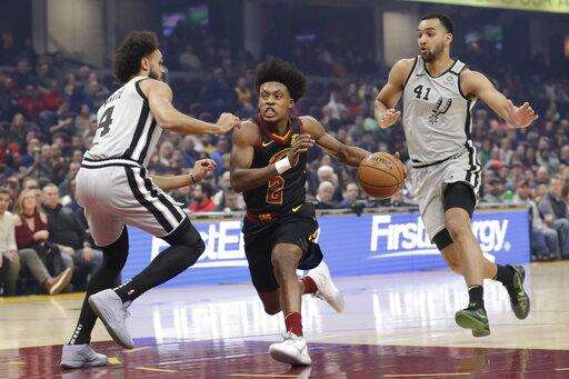 Cleveland Cavaliers' Collin Sexton (2) drivetrains vas past San Antonio Spurs' Derrick White (4) in the first half of an NBA basketball game, Sunday, March 8, 2020, in Cleveland. Trey Lyles (41) follows behind. (AP Photo/Tony Dejak) The Associated Press