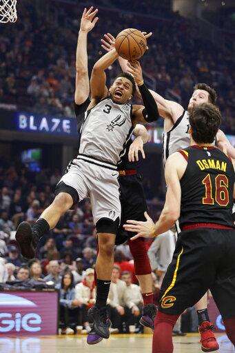 San Antonio Spurs' Keldon Johnson (3) grabs a rebound against the Cleveland Cavaliers in the first half of an NBA basketball game, Sunday, March 8, 2020, in Cleveland. (AP Photo/Tony Dejak) The Associated Press