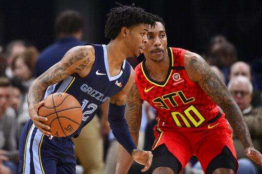 Memphis Grizzlies guard Ja Morant (12) handles the ball against Atlanta Hawks guard Jeff Teague (00) in the first half of an NBA basketball game Saturday, March 7, 2020, in Memphis, Tenn. (AP Photo/Brandon Dill) The Associated Press