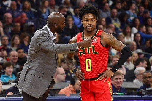 Atlanta Hawks head coach Lloyd Pierce, left, talks with guard Brandon Goodwin (0) in the second half of an NBA basketball game against the Memphis Grizzlies, Saturday, March 7, 2020, in Memphis, Tenn. (AP Photo/Brandon Dill) The Associated Press