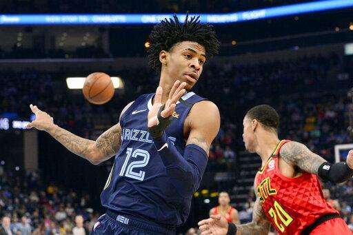 Memphis Grizzlies guard Ja Morant (12) passes the ball behind his back ahead of Atlanta Hawks forward John Collins (20) in the second half of an NBA basketball game Saturday, March 7, 2020, in Memphis, Tenn. (AP Photo/Brandon Dill) The Associated Press