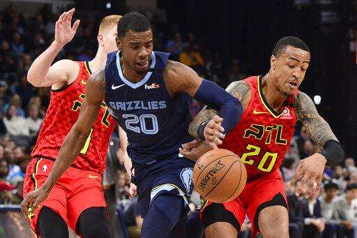 Memphis Grizzlies guard Josh Jackson, front left, and Atlanta Hawks forward John Collins, right, in the second half of an NBA basketball game Saturday, March 7, 2020, in Memphis, Tenn. (AP Photo/Brandon Dill) The Associated Press