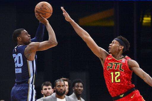 Memphis Grizzlies guard Josh Jackson (20) shoots against Atlanta Hawks forward De'Andre Hunter (12) in the first half of an NBA basketball game Saturday, March 7, 2020, in Memphis, Tenn. (AP Photo/Brandon Dill) The Associated Press