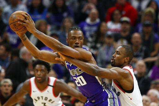 Sacramento Kings forward Harry Giles III (20) keeps the ball out of the reach of Toronto Raptors center Serge Ibaka, right, during the first quarter of an NBA basketball game in Sacramento, Calif., Sunday, March 8, 2020. (AP Photo/Rich Pedroncelli) The Associated Press