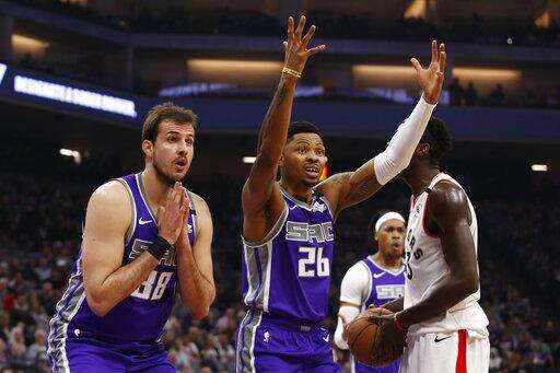 Sacramento Kings' Nemanja Bjelica, left, and Kent Bazemore, center, react after Bazemore was called for fouling Toronto Raptors forward Pascal Siakam, right, during the first quarter of an NBA basketball game in Sacramento, Calif., Sunday, March 8, 2020. (AP Photo/Rich Pedroncelli) The Associated Press