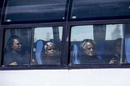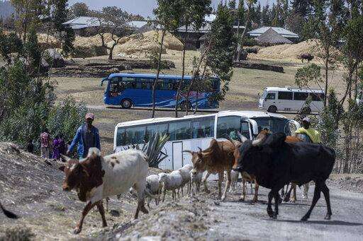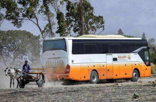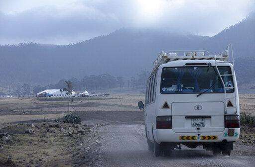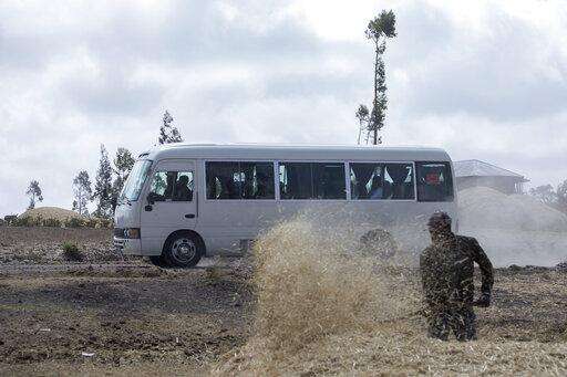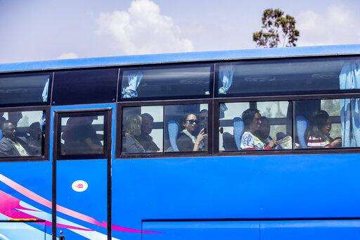 Relatives in buses arrive to attend the memorial service for the one-year anniversary of the crash of Ethiopian Airlines Flight ET302 in the rural Tulufera area near Bishoftu, south-east of the capital Addis Ababa, in Ethiopia Tuesday, March 10, 2020. Grim-faced, visibly grief-stricken, some crying, hundreds of family members gathered Tuesday for a memorial service at the site where one year ago the jet crashed into the rocky ground, killing all 157 on board. (AP Photo/Mulugeta Ayene)