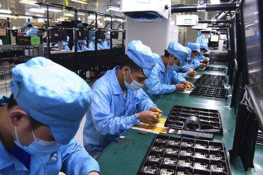 In this Feb. 13, 2020, photo released by Xinhua News Agency, workers wearing masks labor at a factory for Chinese telecommunications company OPPO in Dongguan, in southern China's Guangdong Province. Factories in China, struggling to reopen after the coronavirus shut down the economy, face a new threat from U.S. anti-disease controls that might disrupt the flow of microchips and other components they need. For most people, the new coronavirus causes only mild or moderate symptoms. For some it can cause more severe illness. (Chen Yuxuan/Xinhua via AP)