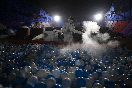 A worker sprays disinfectant as a precaution against the new coronavirus on ball pool for Kids Cinema at Quartier Cineart movie theater in Bangkok, Thailand, Thursday, March 19, 2020. Thailand's government has enacted stronger measures to combat the spread of the coronavirus, including postponing the country's biggest holiday, shutting down schools, movie theaters and closing bars. For most people, the new coronavirus causes only mild or moderate symptoms. For some it can cause more severe illness. (AP Photo/Sakchai Lalit)