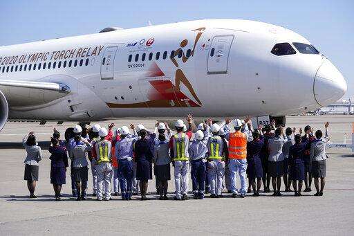 Ground crews of Japanese airlines wave to the special "Tokyo 2020 Go" aircraft that will transport the Olympic Flame to Japan after the Torch Handover Ceremony in Greece, on its departure at Haneda International Airport in Tokyo Wednesday, March 18, 2020. (AP Photo/Eugene Hoshiko)