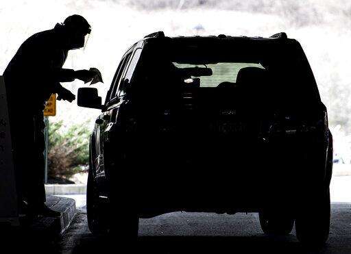 Clinical staff workers conduct a drive-thru COVID-19 test Wednesday, March 18, 2020, at Allegheny Health Network's Wexford Health + Wellness Pavilion in Wexford, Pa. (Steph Chambers/Pittsburgh Post-Gazette via AP)