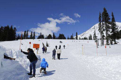 Visitors to Mount Rainier National Park walk toward the sledding area at Paradise on Wednesday, March 18, 2020, in Washington state. Most national parks are remaining open during the outbreak of the new coronavirus, but many are closing visitor centers, shuttles, lodges and restaurants in hopes of containing its spread. (AP Photo/Ted S. Warren)
