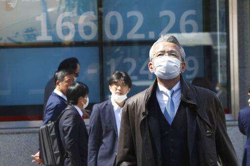 People walk by an electronic stock board of a securities firm in Tokyo, Thursday, March 19, 2020. Shares in Asia failed to hold onto opening gains on Thursday, skidding further after the latest selloff on Wall Street. (AP Photo/Koji Sasahara)