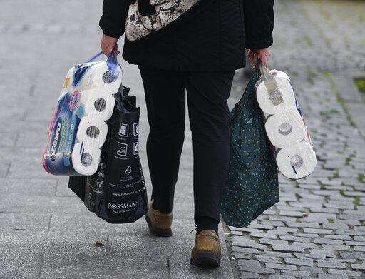 A woman carries her shopping including bags of toilet paper, in downtown Frankfurt, Germany, Wednesday, March 18, 2020. Because of the spread of the coronavirus, bars, cinemas, theatres, museums, and many shops are now closed. For most people, the new coronavirus causes only mild or moderate symptoms. For some it can cause more severe illness. (Arne Dedert/dpa via AP)