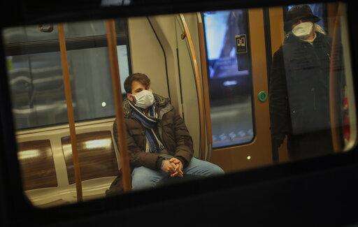 People wearing face masks travel by metro in Brussels, Wednesday, March 18, 2020. Belgium has ordered further lockdown measures starting Wednesday, following in the steps of European neighbours Italy, Spain and France. For most people, the new coronavirus causes only mild or moderate symptoms, such as fever and cough. For some, especially older adults and people with existing health problems, it can cause more severe illness, including pneumonia. (AP Photo/Francisco Seco)
