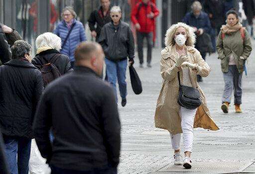 Pepole walk on a shopping road in Berlin, Germany, Thursday, March 19, 2020. Due to the coronavirus outbreak German authorities ask people to avoid large crowds of people. For most people, the new coronavirus causes only mild or moderate symptoms. For some it can cause more severe illness. (AP Photo/Michael Sohn)