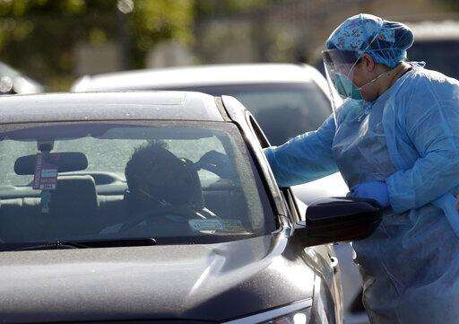 A man is swabbed as he is tested for COVID-19 as vehicles line up at the Doris Ison Health Center, Wednesday, March 18, 2020, in Miami. The testing is being provided by Community Health of South Florida, Inc. According to the World Health Organization, most people recover in about two to six weeks, depending on the severity of the illness. (AP Photo/Lynne Sladky)