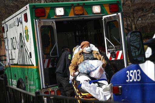 A patient wears a protective face mask as she is loaded into an ambulance at The Brooklyn Hospital Center emergency room, Wednesday, March 18, 2020, in New York. Anticipating a spike in coronavirus patients, New York City-area hospitals are clearing out beds, setting up new spaces to triage patients and urging people with mild symptoms to consult health professionals by phone or video chat instead of flooding emergency rooms that could be overrun. (AP Photo/John Minchillo)