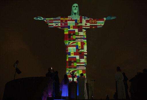 Rio's Christ the Redeemer statue is lit up with the flags of countries currently afflicted by the new coronavirus in Rio de Janeiro, Brazil, Wednesday, March 18, 2020. For most people COVID-19 causes mild or moderate symptoms. For others, especially the elderly and people with existing health problems, it can cause many other serious illnesses, including pneumonia. (AP Photo/Silvia Izquierdo)