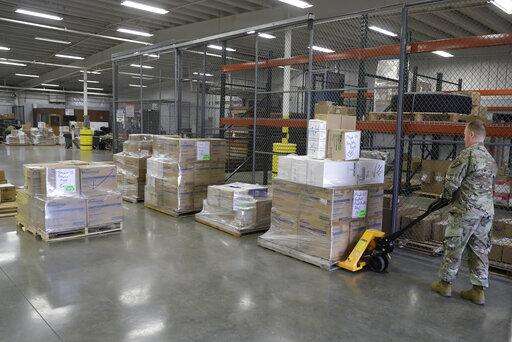 A Indiana National Guardsman lines up a pallets of medical supplies, Thursday, March 26, 2020, in Indianapolis. The medical supplies were being delivered to Indiana hospitals and health departments to help fight the coronavirus pandemic. (AP Photo/Darron Cummings) The Associated Press